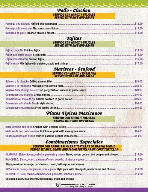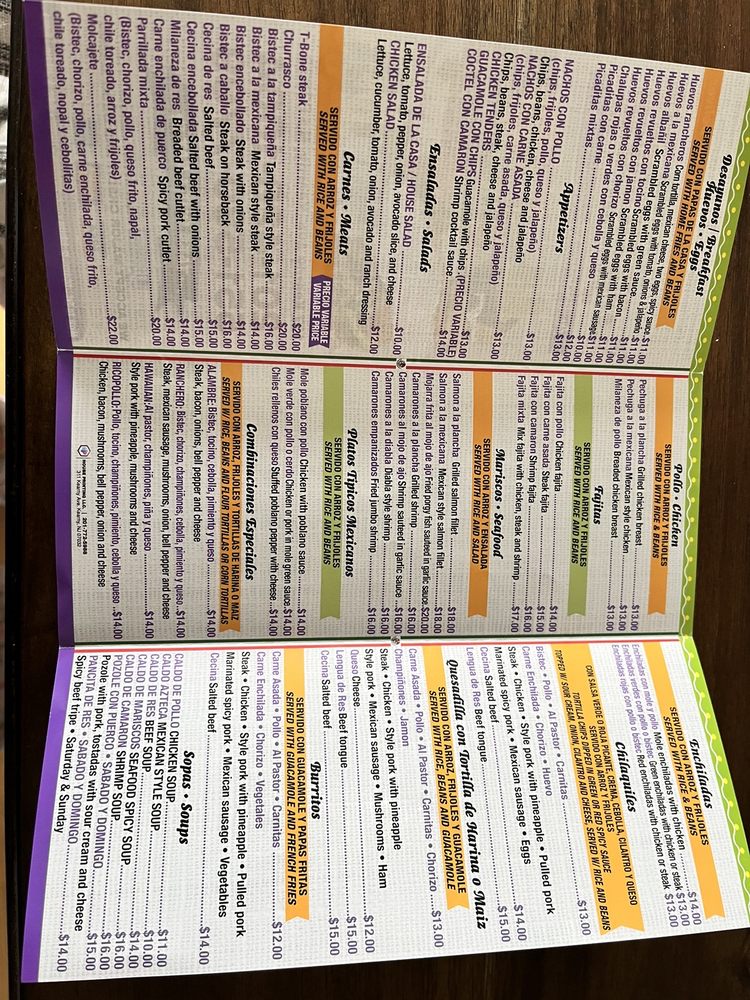 Steak, Mexican sausage, chicken, spicy pork, fried cheese, grill jalapeo, Mexican cactus, Mexican scallion onion served with rice and beans. Bistek, chorizo, pollo, c enchilada, queso frito, chile toreado, nopal y cebollita.